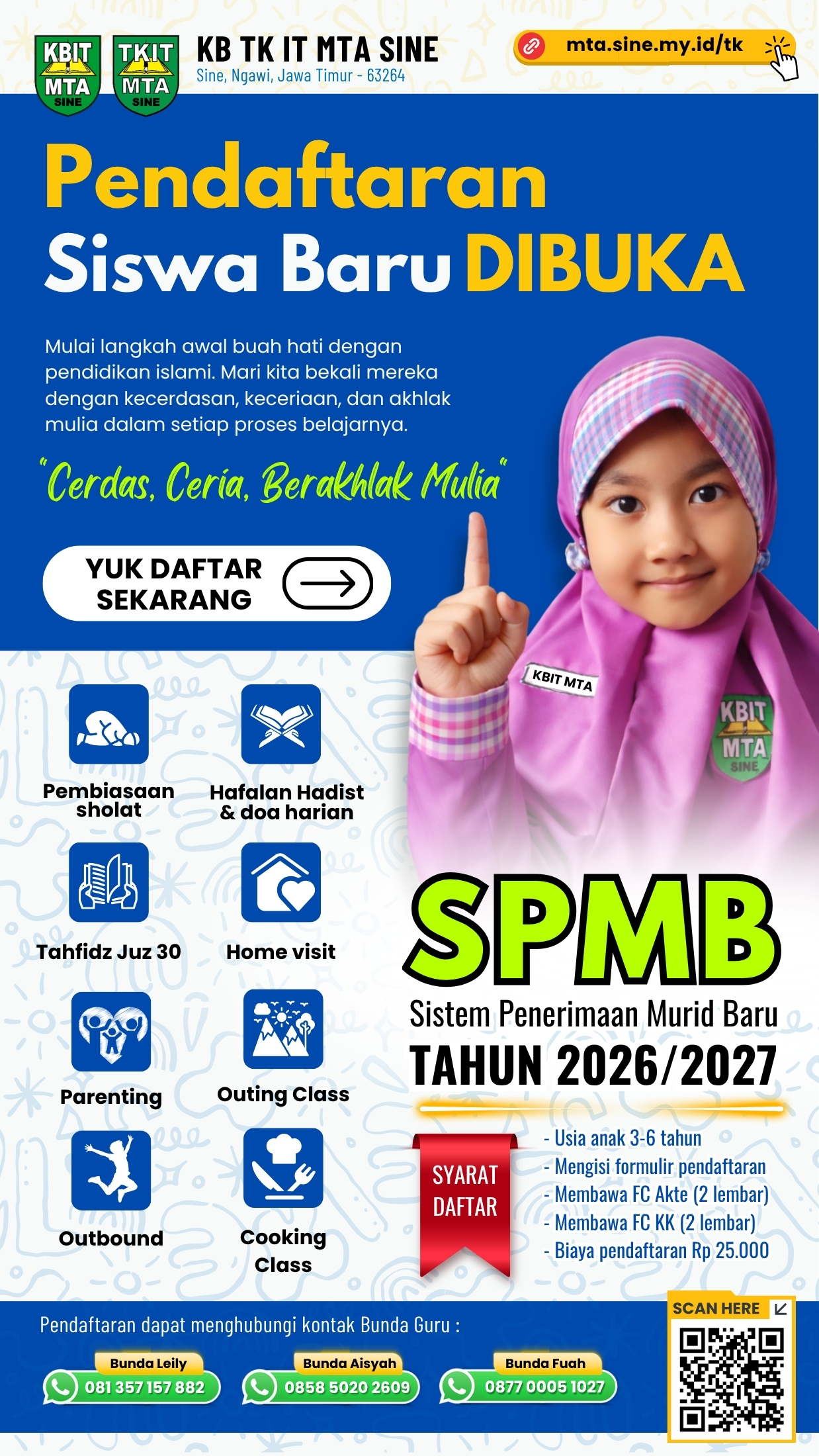 KB TK IT MTA Sine membuka SPMB Tahun Ajaran 2026/2027. Mengusung pembelajaran islami, menyenangkan, dan berpusat pada anak, didukung program unggulan seperti pembiasaan sholat, Tahfidz Juz 30, cooking class, parenting & home visit, serta outing class.